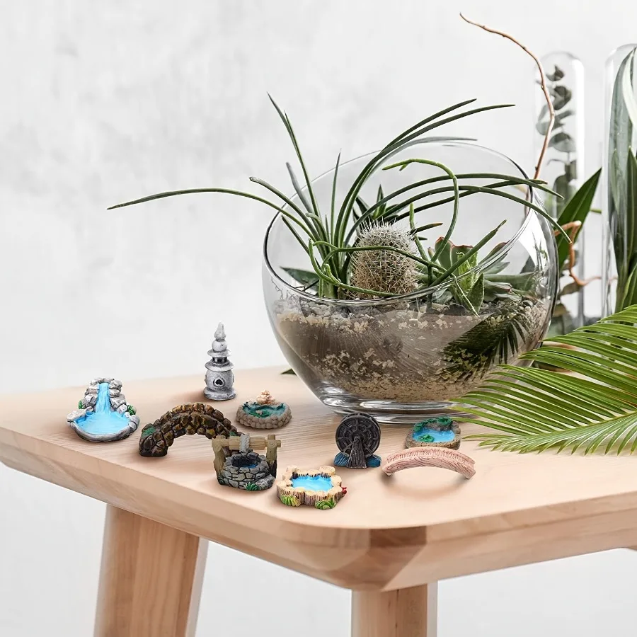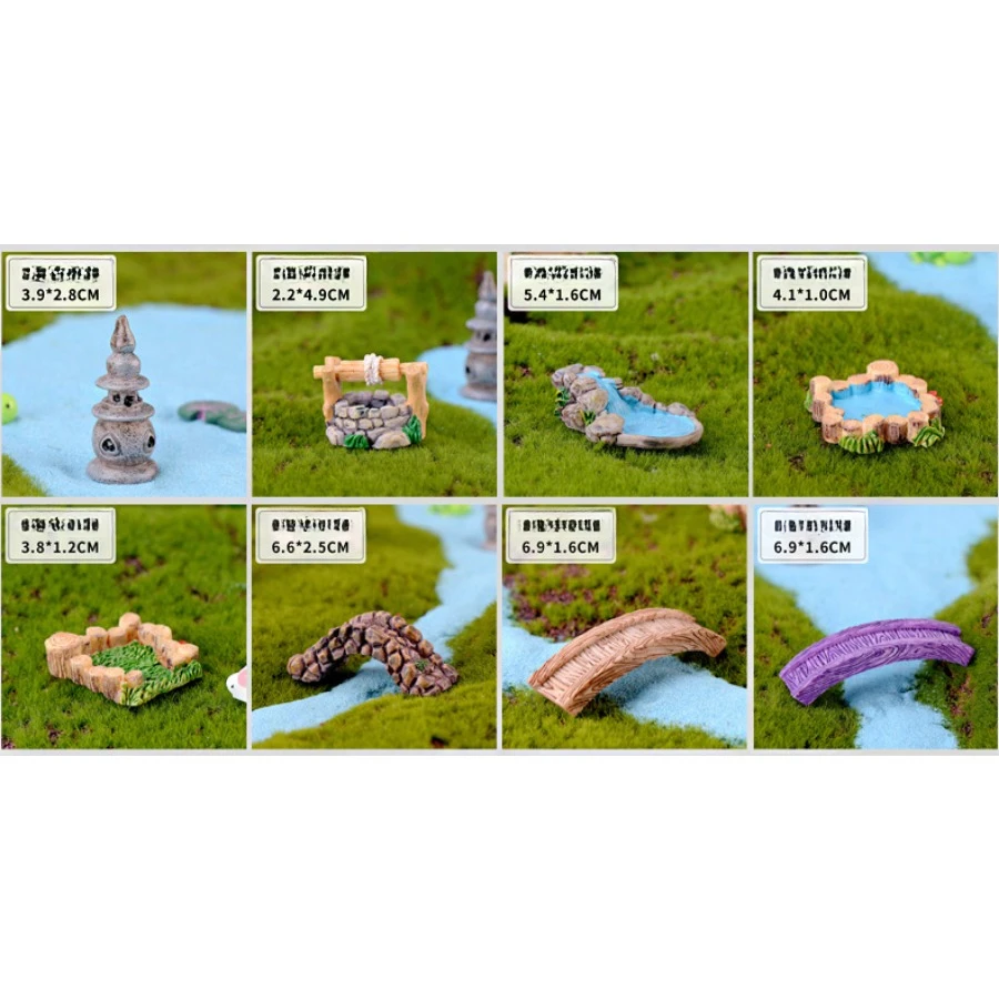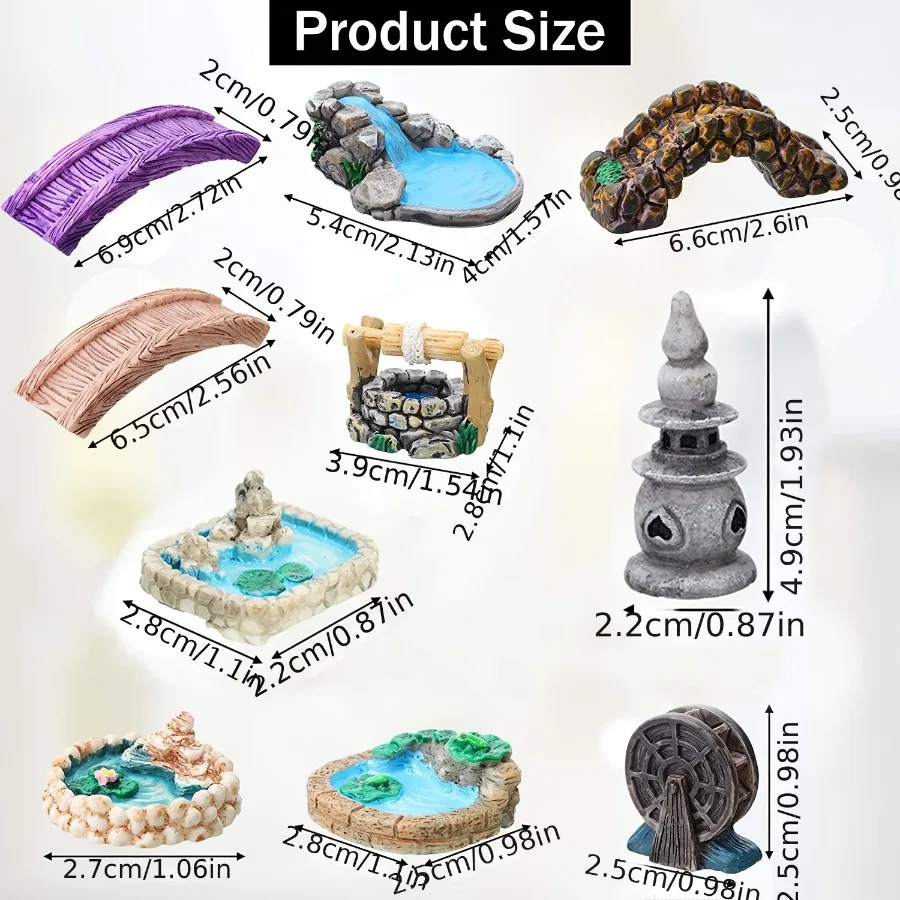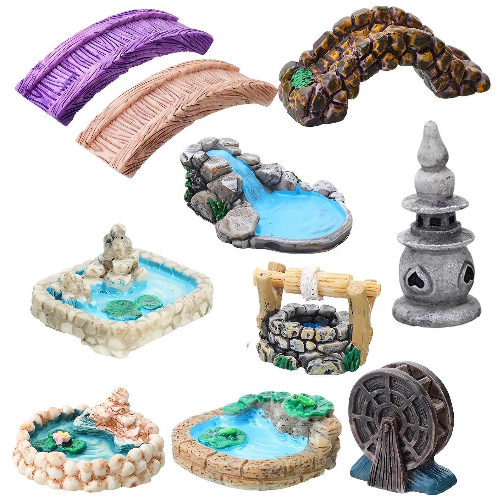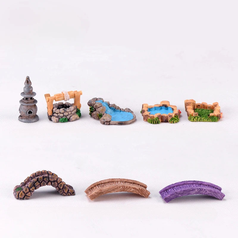 This fairy garden miniature set offers a selection of resin-crafted elements including a miniature bridge, pond, lighthouse water well, and other tiny figurine accessories. Designed for DIY craft enthusiasts, it serves as an elegant lawn ornament without any harmful chemicals, ensuring safe and detailed decoration for your outdoor or indoor miniature landscapes.