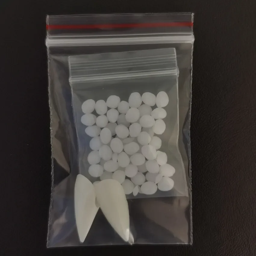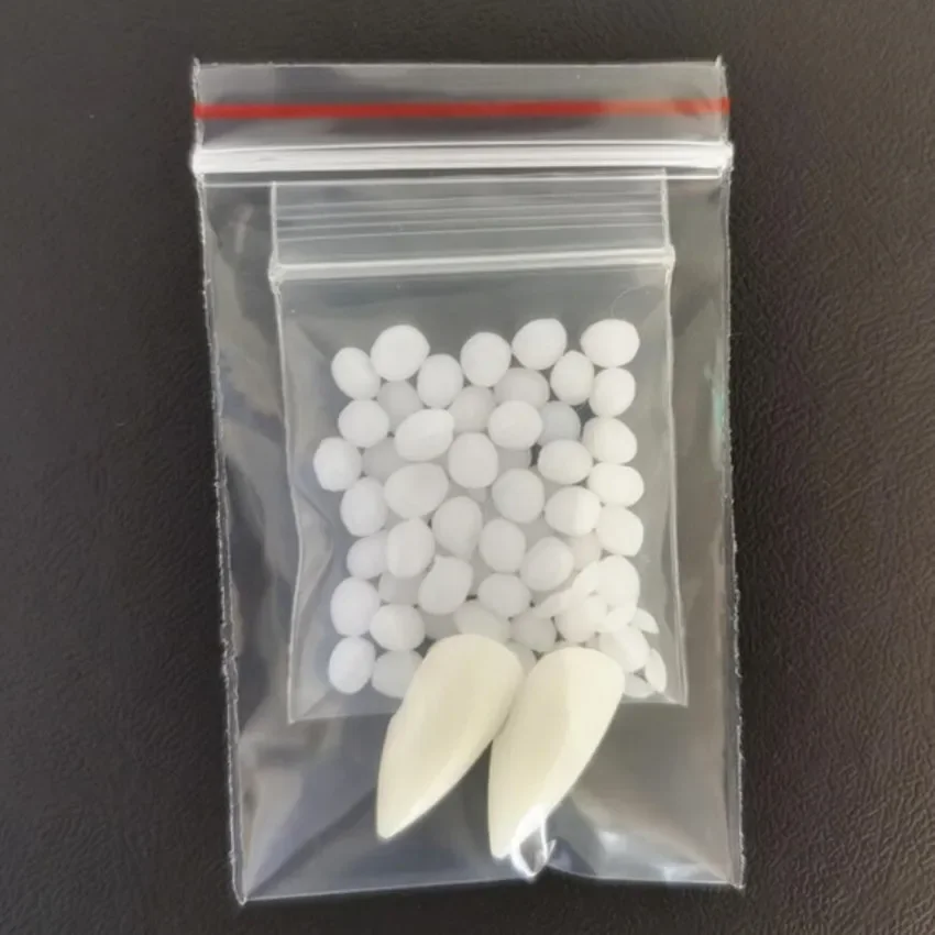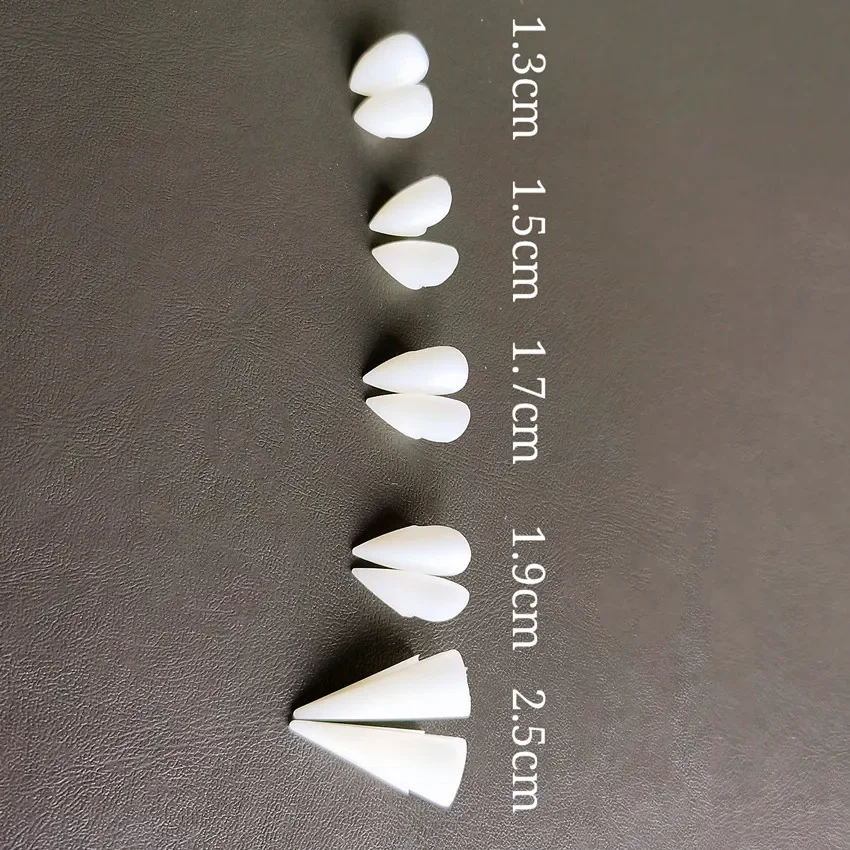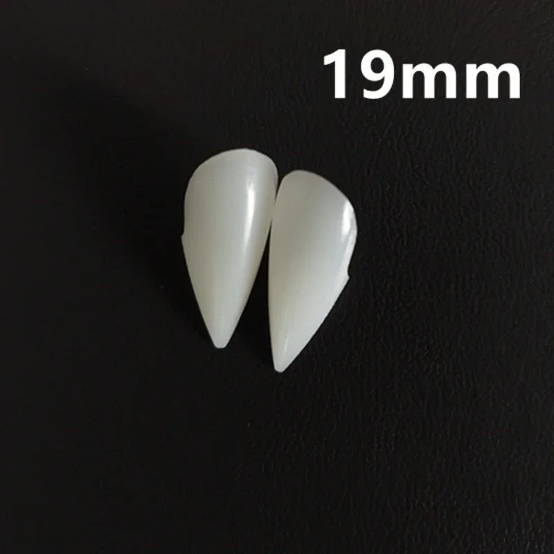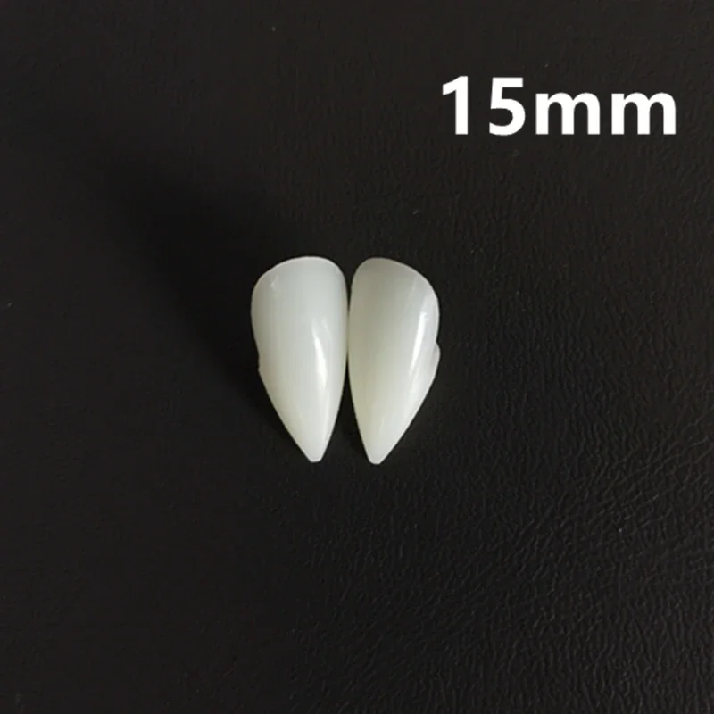These resin vampire teeth fangs are perfect for Halloween, cosplay, or themed parties. Made from non-toxic, tasteless, and eco-friendly resin, they come in sizes 13mm, 15mm, 17mm, and 19mm. If needed, trim along the gum line for a better fit. To use, soak in warm water above 70°C until the gum turns transparent, then place inside your mouth and let it cool before wearing. Each set includes one pair of false teeth and approximately 3g of adhesive for secure attachment. Ideal for creating a realistic vampire look with ease and comfort.